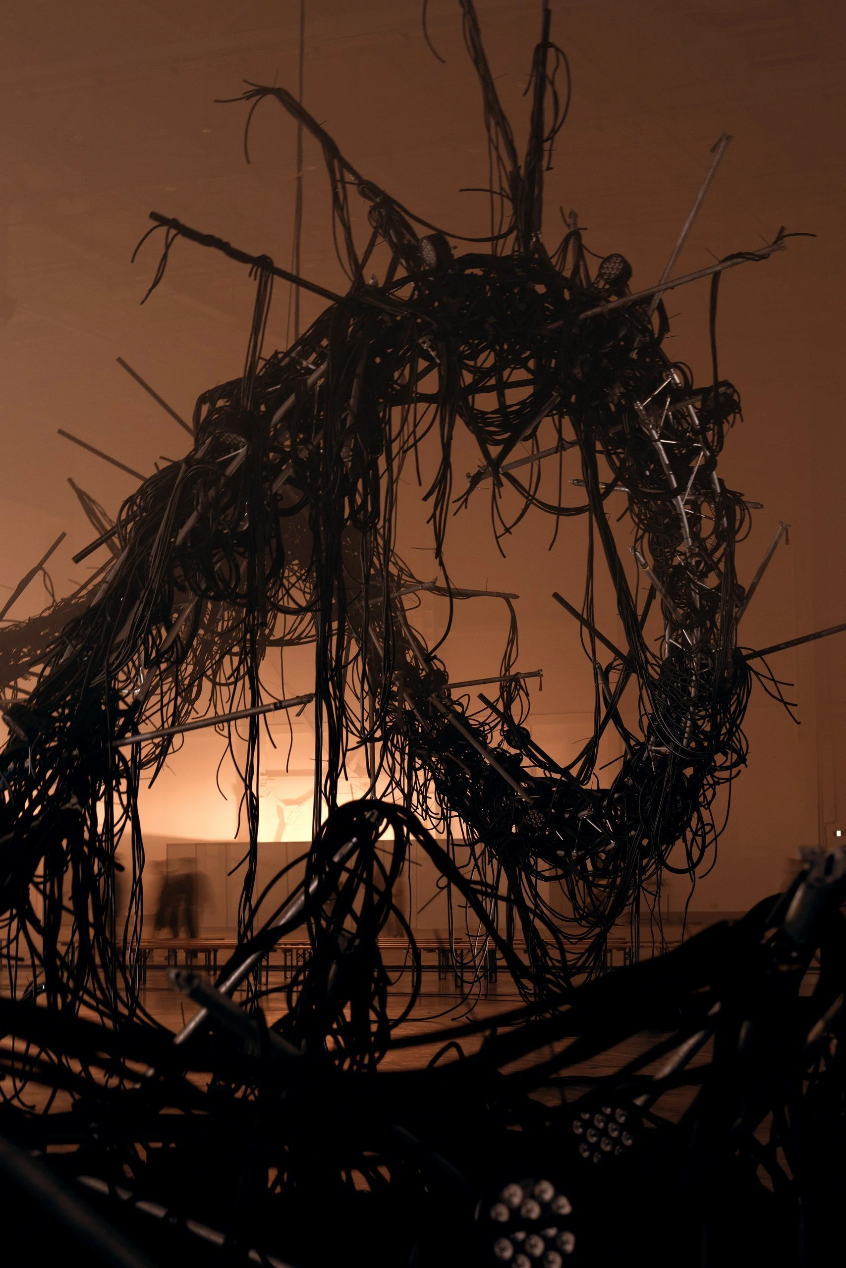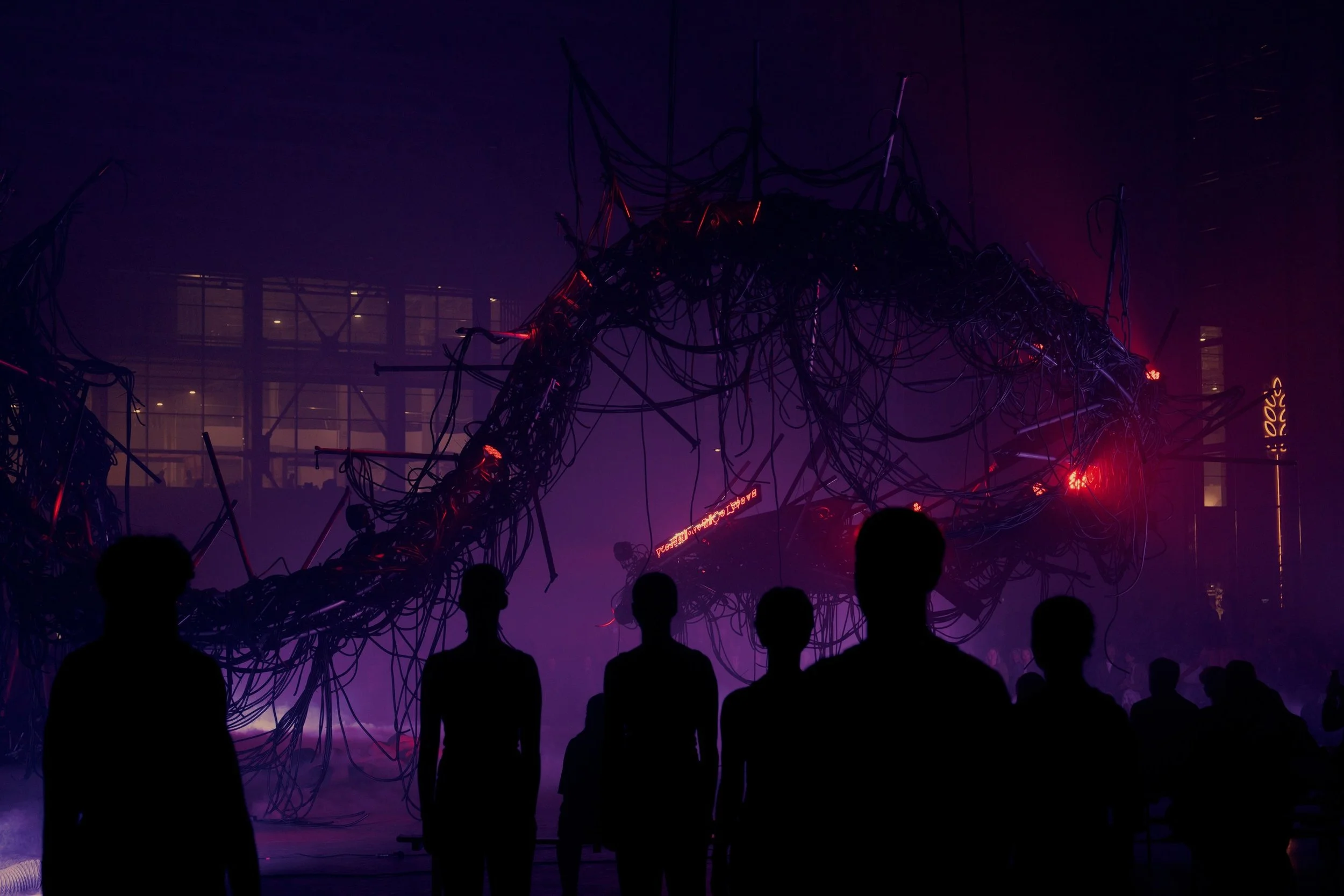A SCULPTURAL MULTIMEDIA INSTALLATION CREATED AT THE INTERSECTION OF PERFORMATIVE ART, ENGINEERING, AND PHILOSOPHY. IT BECOMES A LIVING ARCHITECTURE OF TIME / A CHRONOFORM: A BODY IN TRANSFORMATION, A MACHINE OF PERCEPTION, AND A WITNESS TO THE FRAGILE DIALOGUE BETWEEN HUMAN AND ARTIFICIAL INTELLIGENCE. IN THIS PIECE, TRUST, PROGRESS, AND MEMORY ARE EMBODIED NOT THROUGH WORDS, BUT THROUGH MATTER/LIGHT, MOVEMENT, AND ENGINEERED STRUCTURE.