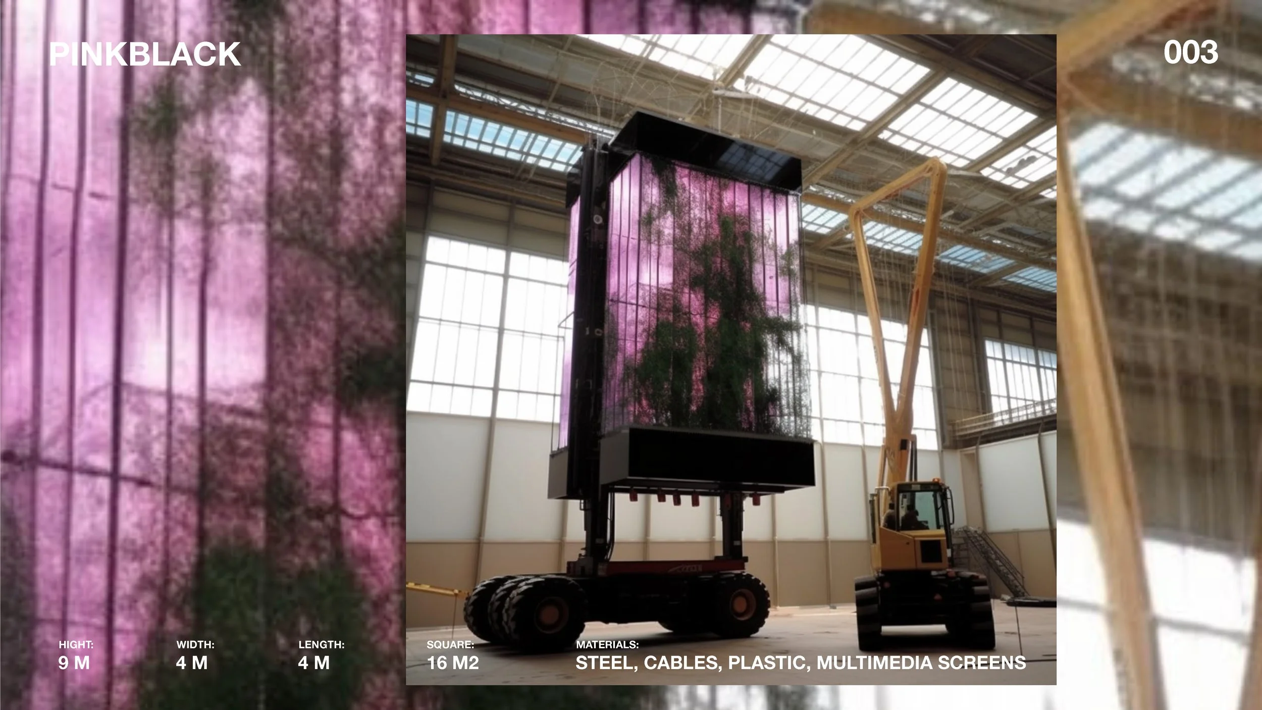 THE INSTALLATION FEATURES AN 8-METER-TALL LIFT SUPPORTING A LAYERED CUBE MADE OF PINK MESH LED SCREENS. THE SCREENS ARE ARRANGED IN MULTIPLE LAYERS, WITH CORRUGATED TUBING WOVEN THROUGH THEM, ADDING TEXTURE AND DEPTH TO THE STRUCTURE. THE INTERPLAY BETWEEN THE GLOWING PINK SCREENS AND THE INDUSTRIAL LOOK OF THE TUBING CREATES A UNIQUE VISUAL TENSION, SYMBOLIZING THE FUSION OF SOFTNESS AND RIGIDITY, COLOR AND FORM. THIS DYNAMIC COMPOSITION BLURS THE LINES BETWEEN LIGHT, TECHNOLOGY, AND MATERIAL, OFFERING A MINIMALIST YET IMPACTFUL VISUAL EXPERIENCE.