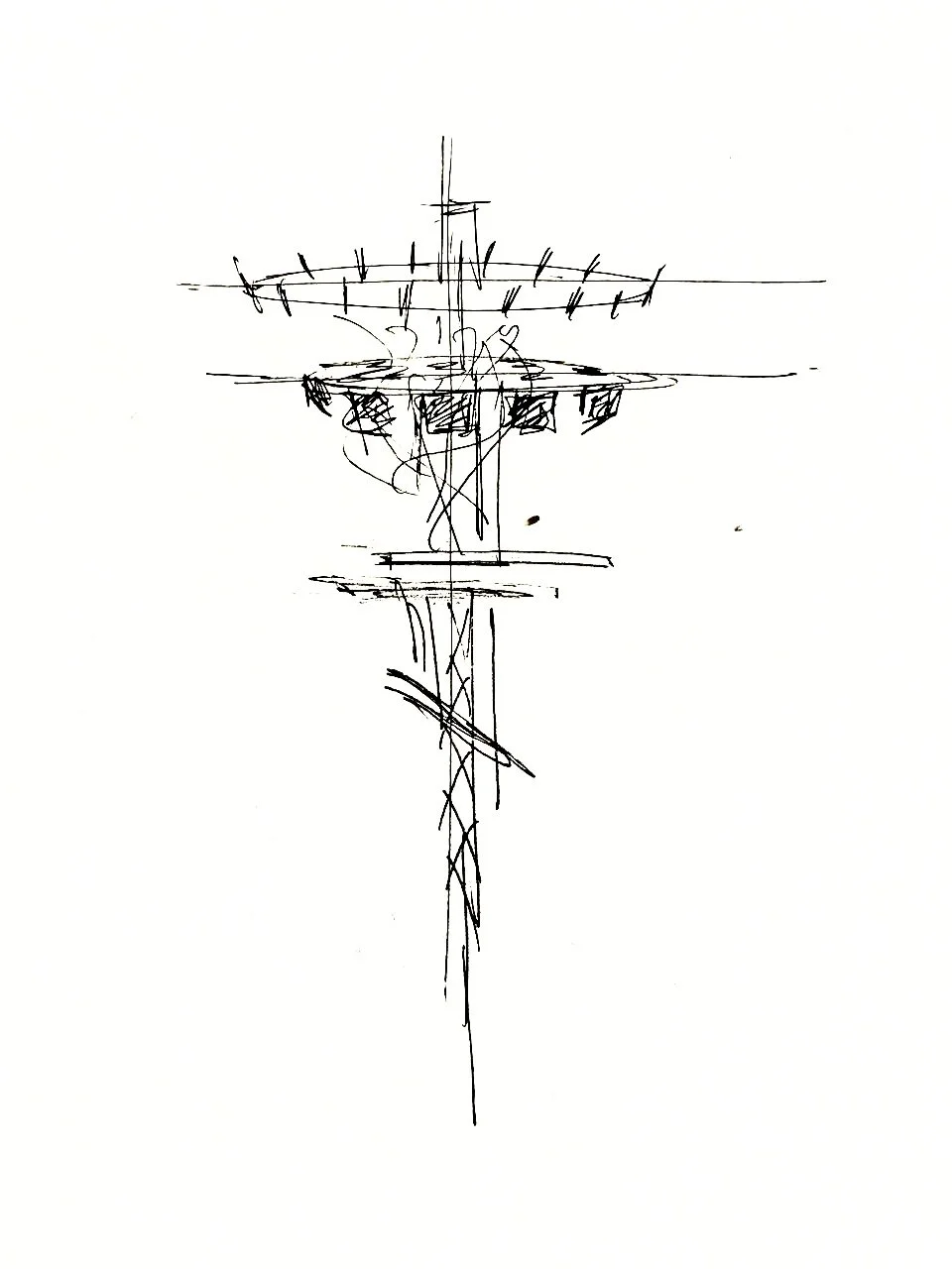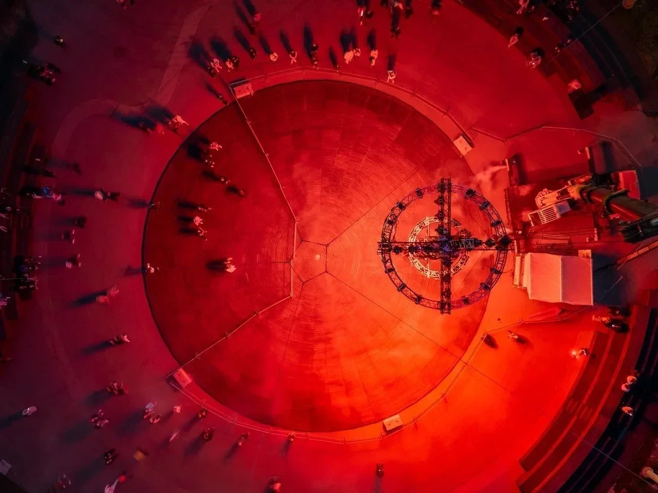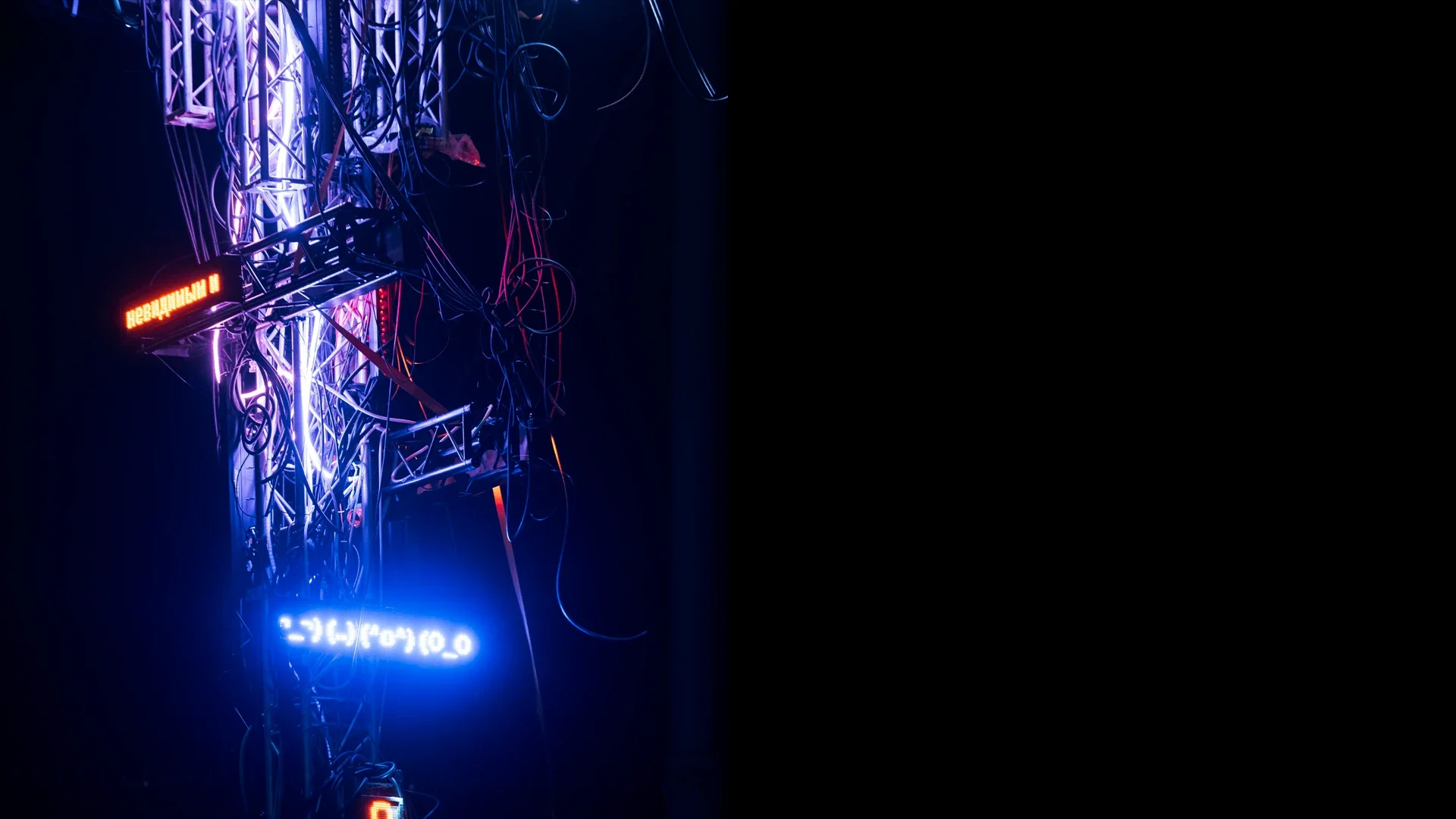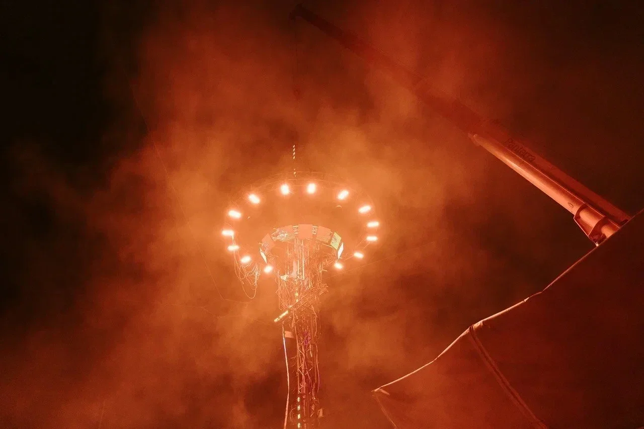 this INSTALLATION FEATURES A MASSIVE CRANE SUPPORTING A COMPLEX STRUCTURE OF TRUSSES, LIGHTING FIXTURES, AND CABLES, FORMING A MONUMENTAL GATE TO ANOTHER DIMENSION. "TERMINAL" REPRESENTS A CONVERGENCE POINT WHERE TECHNOLOGY, ENGINEERING, AND ART CREATE A PORTAL BETWEEN WORLDS. THE INDUSTRIAL CRANE, SYMBOLIZING MECHANICAL STRENGTH, HOLDS THIS GATE, MERGING THE CHAOS OF CABLES AND THE PRECISION OF LIGHT. THE LIGHTING DESIGN FORMS AN IMMERSIVE AND DYNAMIC SPACE, INVITING VIEWERS TO STEP THROUGH THE GATE INTO AN ALTERNATE REALITY