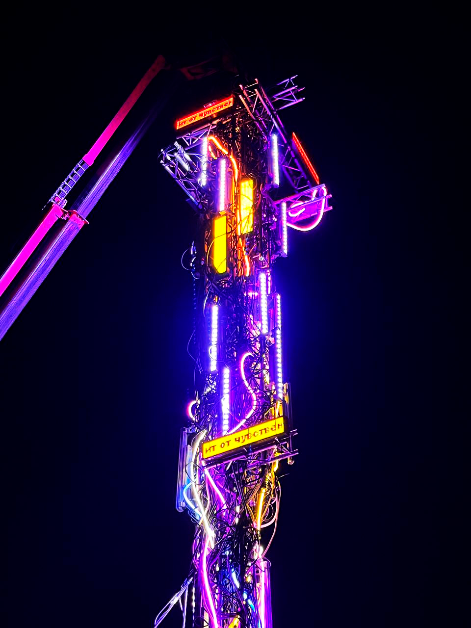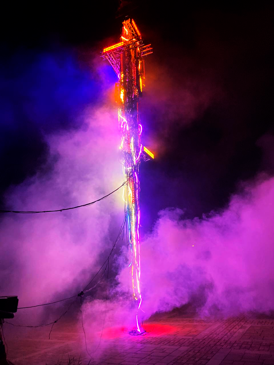 THIS INSTALLATION FEATURES A MASSIVE CRANE SUPPORTING A COMPLEX STRUCTURE OF TRUSSES, LIGHTING FIXTURES, AND CABLES, FORMING A MONUMENTAL GATE TO ANOTHER DIMENSION. "TERMINAL" REPRESENTS A CONVERGENCE POINT WHERE TECHNOLOGY, ENGINEERING, AND ART CREATE A PORTAL BETWEEN WORLDS. THE INDUSTRIAL CRANE, SYMBOLIZING MECHANICAL STRENGTH, HOLDS THIS GATE, MERGING THE CHAOS OF CABLES AND THE PRECISION OF LIGHT. THE LIGHTING DESIGN FORMS AN IMMERSIVE AND DYNAMIC SPACE, INVITING VIEWERS TO STEP THROUGH THE GATE INTO AN ALTERNATE REALITY.